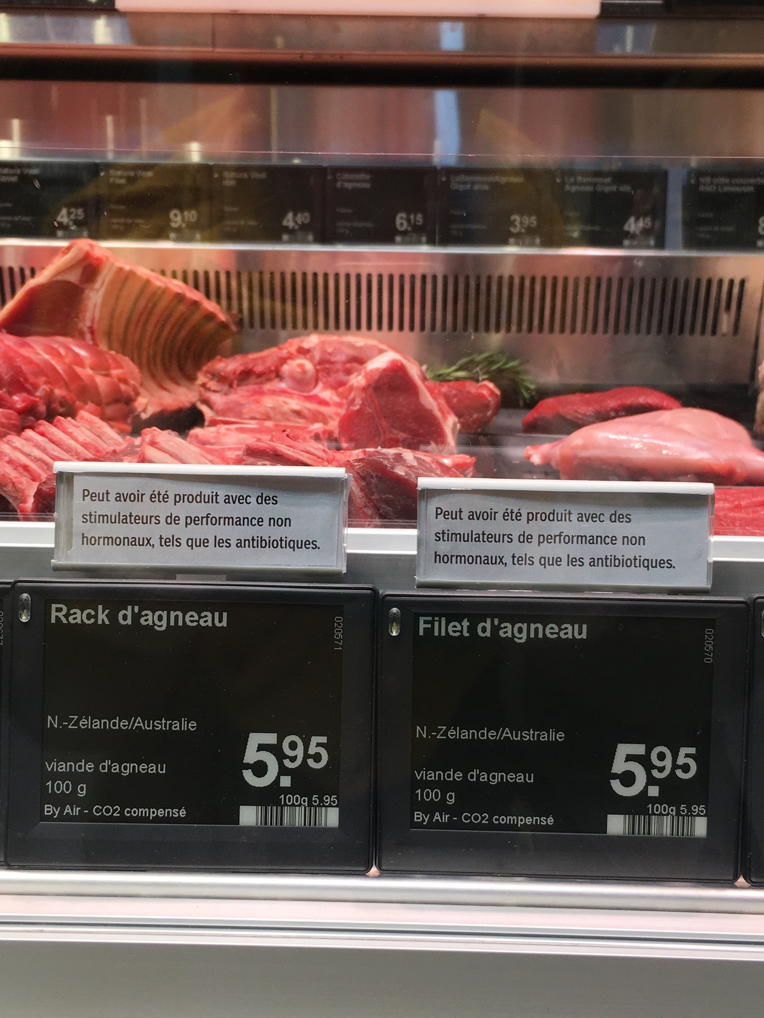 Si on se dirige vers l’espace réservé à la viande, on découvre que le rack et le filet d’agneau viennent de Nouvelle-Zélande/Australie, à presque 20’000 km de la Suisse. Et qui plus est, il semblerait qu’ils aient pu être produits avec des « stimulateurs de performance non-hormonaux » de type antibiotiques (cf. image).